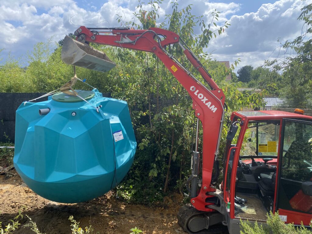 Réalisation sur Nozay 91 – Installation d’une cuve à eau de 5000 litres, elle alimente désormais les sanitaires et la machine à laver, diminuant la consommation d’eau potable de la famille. 1 point pour la protection du cycle de l’eau!